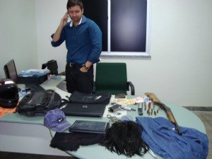 Foram apreendidos R$ 294,00, duas chaves de fenda, chaves minchas, uma espingarda com munição, uma pistola, dois celulares, dois notebooks e a moto utilizada na fuga.